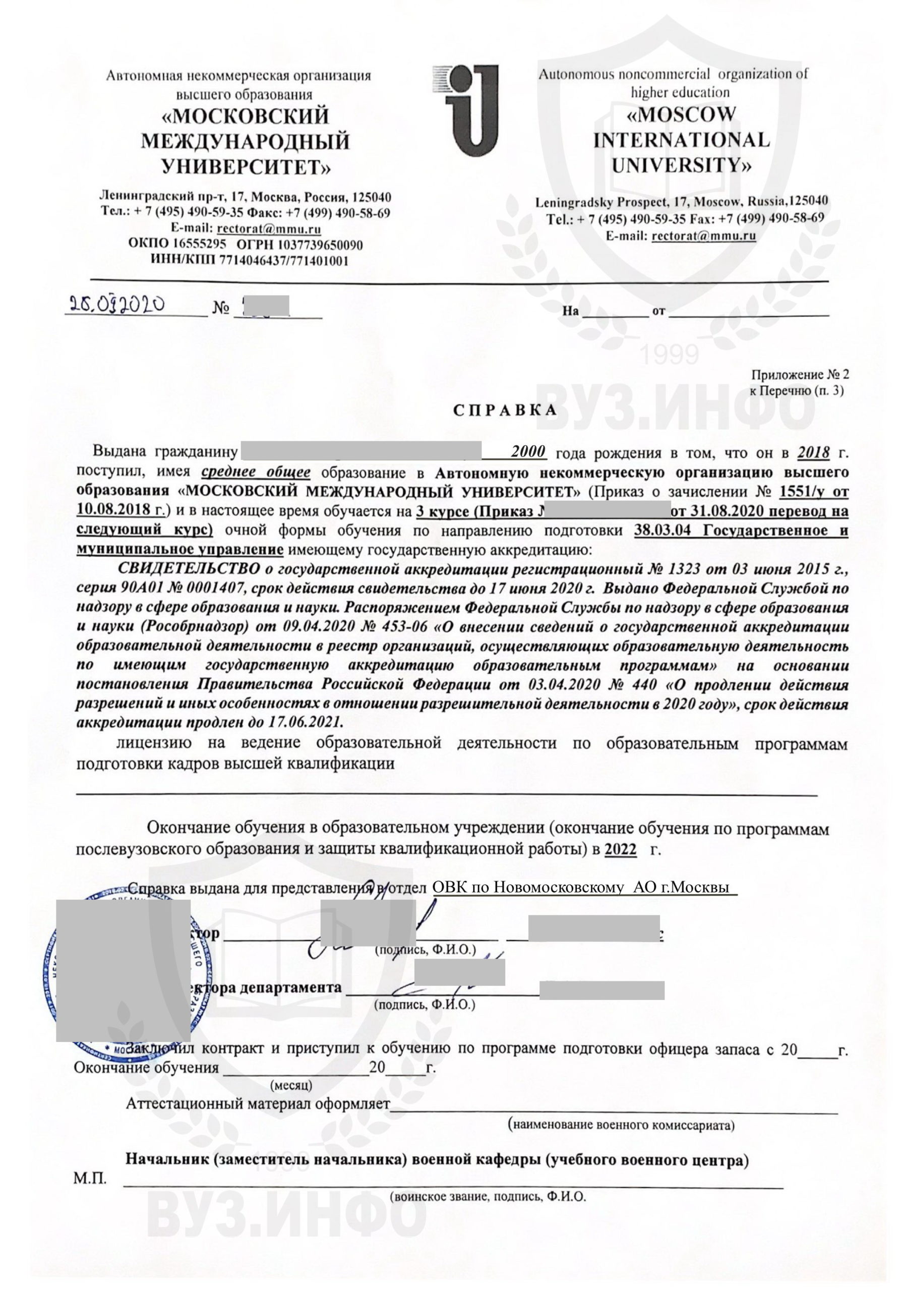 Купить справку Приложение №2 к перечню 3 для военкомата из ВУЗа (для отсрочки)